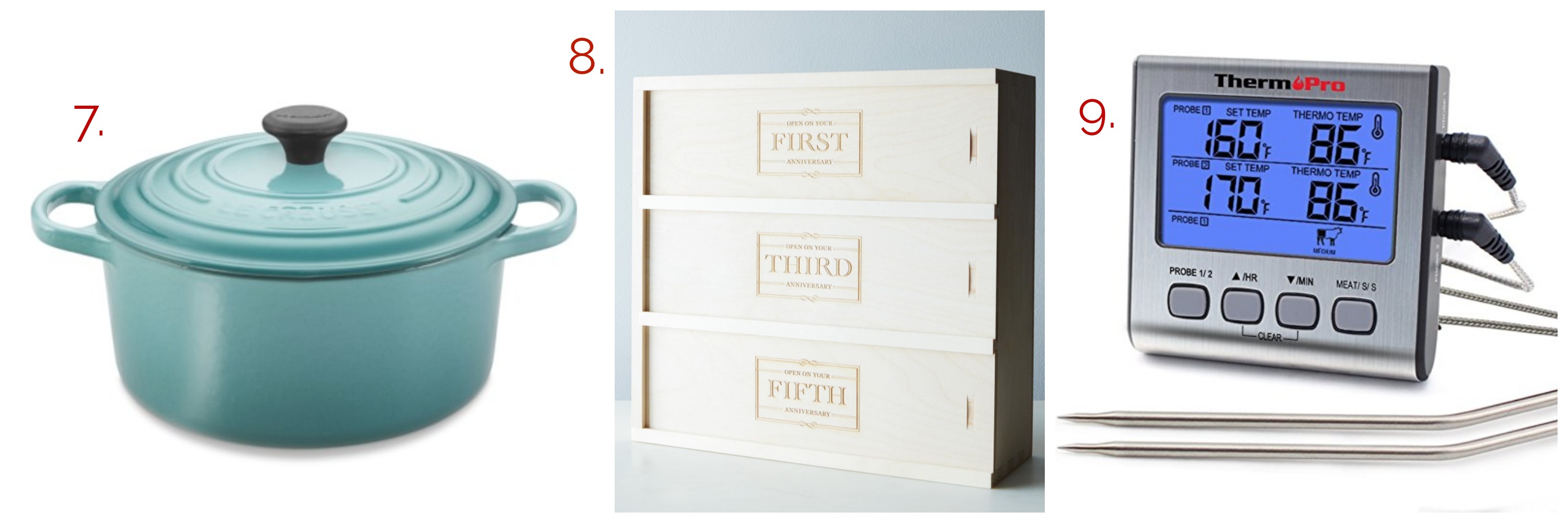 - ThermoPro Digital Cooking Thermometer. A meat thermometer may not be the sexiest present, but giving the gift of perfectly cooked meat is actually quite thoughtful/timeless. In fact, my roommate gifted me a similar thermometer circa 2013, and it’s my favorite thing he’s ever given me. (Excluding my engagement ring and the proposal blanket. Duh.) If you want to go really ham, you could gift a fancy roasting pan like this and the thermometer.
