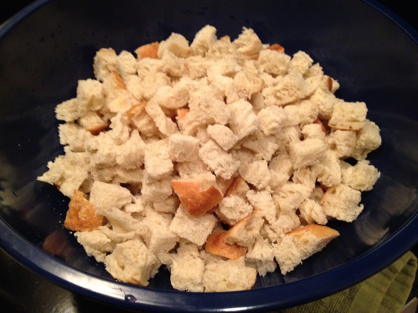 -Cut stale bread into ¾ inch cubes and place them in a large mixing bowl. (If you don’t have the time to wait for bread to go stale, you can put the cubes on a cookie sheet and dry them out in a 300 the oven for about 10 minutes. Just make sure they don’t brown too much!)