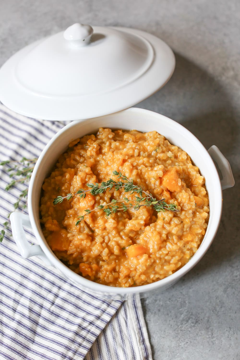 Lest you think I’ve gone full Debbie Downer on you, friends, I was just getting to the happy part! I’m incredibly grateful for my Vienna Boys’ Choir experience for several reasons. First, I finally got to see Carnegie Hall, which was every bit as majestic as I imagined. Second, I can cross “choir groupie” off my list of potential hobbies (it is helpful to know what you do NOT like in life as well as what you do!). And finally, my boredom and angst during the concert led to my spending almost two full hours daydreaming about food, which reminded me that I had completely forgotten to share this fabulous Butternut Squash Brown Rice with Fontina and Thyme with you. Silver lining to end all silver linings!