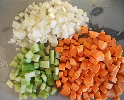 -Peel your carrots, celery, and onion, and then chop each mirepoix- this is a fancy French term that I shall poetically translate as “rough cubes.”