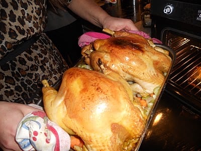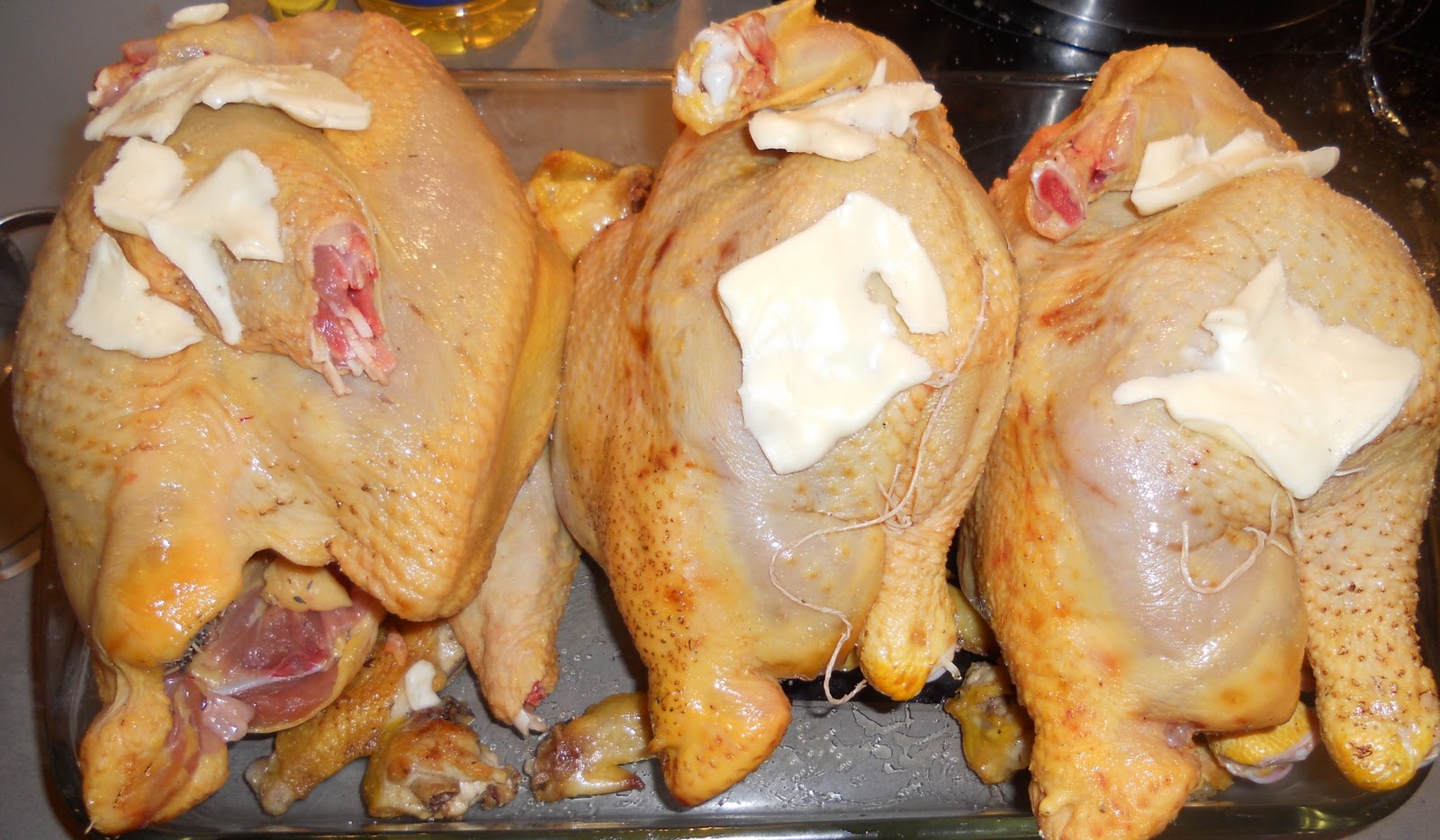 -Place the chicken in a roasting dish on its side. Add 1 or 2 slices of butter to the skin and put yo bird in the oven.