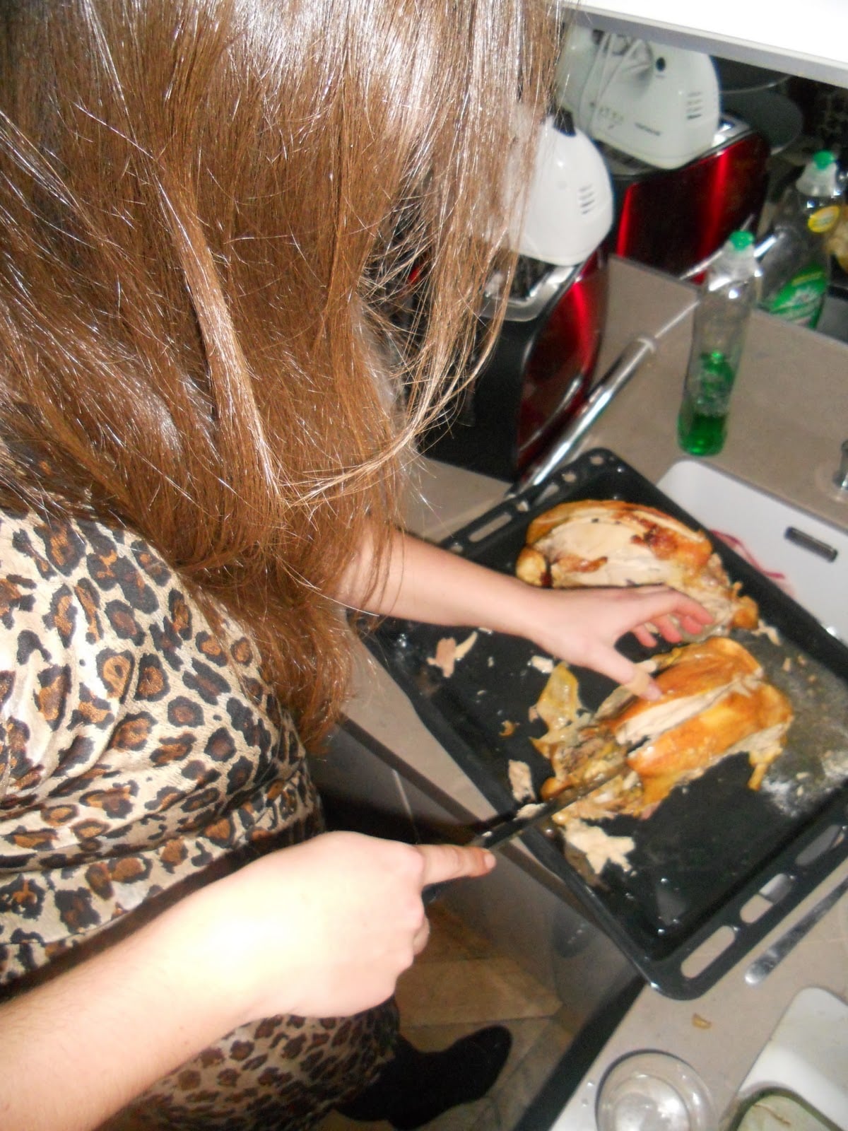 When I arrived at Liberty’s apartment that afternoon, she happily unveiled the groceries. Due to unforeseen “stock issues,” the produce was a pretty pathetic sight. We’re talking oddly shaped potatoes, suspiciously cracked carrots, slightly brown onions, etc. However, all of this was momentarily overlooked, as Liberty was eager to reveal the prized chickens. When I unwrapped the chickens from their packaging, I found several birthday surprises. I suppose my lack of effusive praise for the chickens’ beauty, or perhaps my lack of words in general, tipped Liberty off to the fact that there may be something wrong with her babies. “Liberty…why do the chickens still have their feet? And, more importantly, WHY DO THEY STILL HAVE THEIR NECKS?” Response: “Is that bad?
