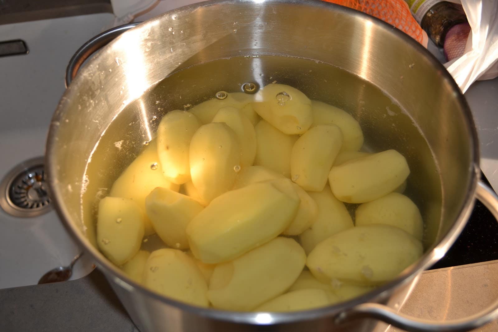 -Boil the potatoes until very tender. (To see if your potatoes are cooked, peirce them with a knife. If the knife slides in easily, those suckers are done.)