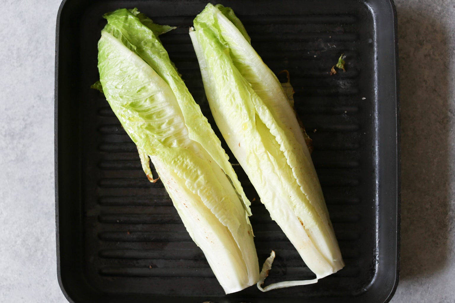 - Moving on to the romaine. (If you have a large enough grill, you can cook the romaine and corn simultaneously!). Brush the cut-side of the romaine hearts lightly with olive oil. Place them on the grill, cut-side down, and cook for 2-3 minutes, just until grill marks appear and the leaves have softened slightly.