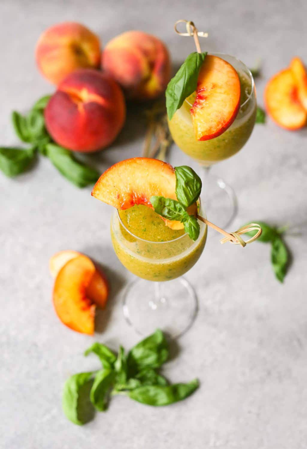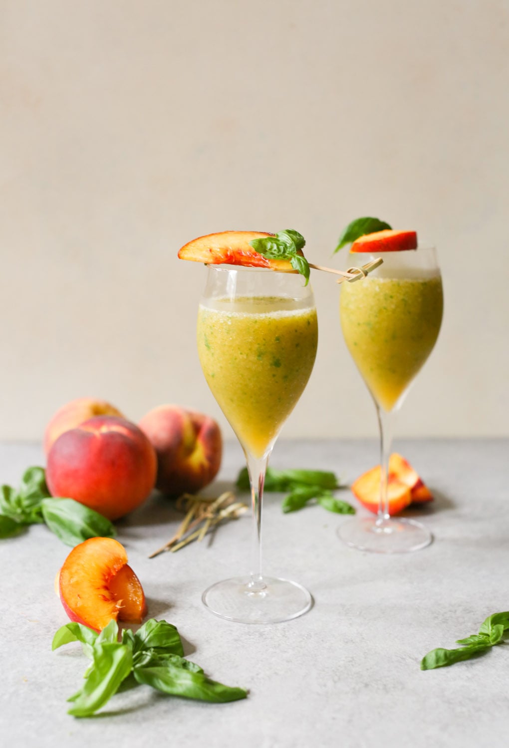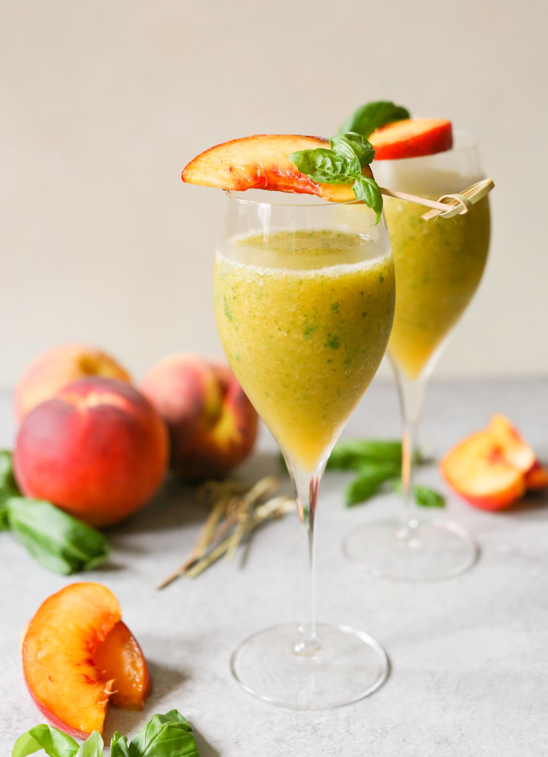 - Add the peaches and Prosecco/champagne to a blender and blend until smooth. Add the basil and pulse until it's broken down into very small pieces.