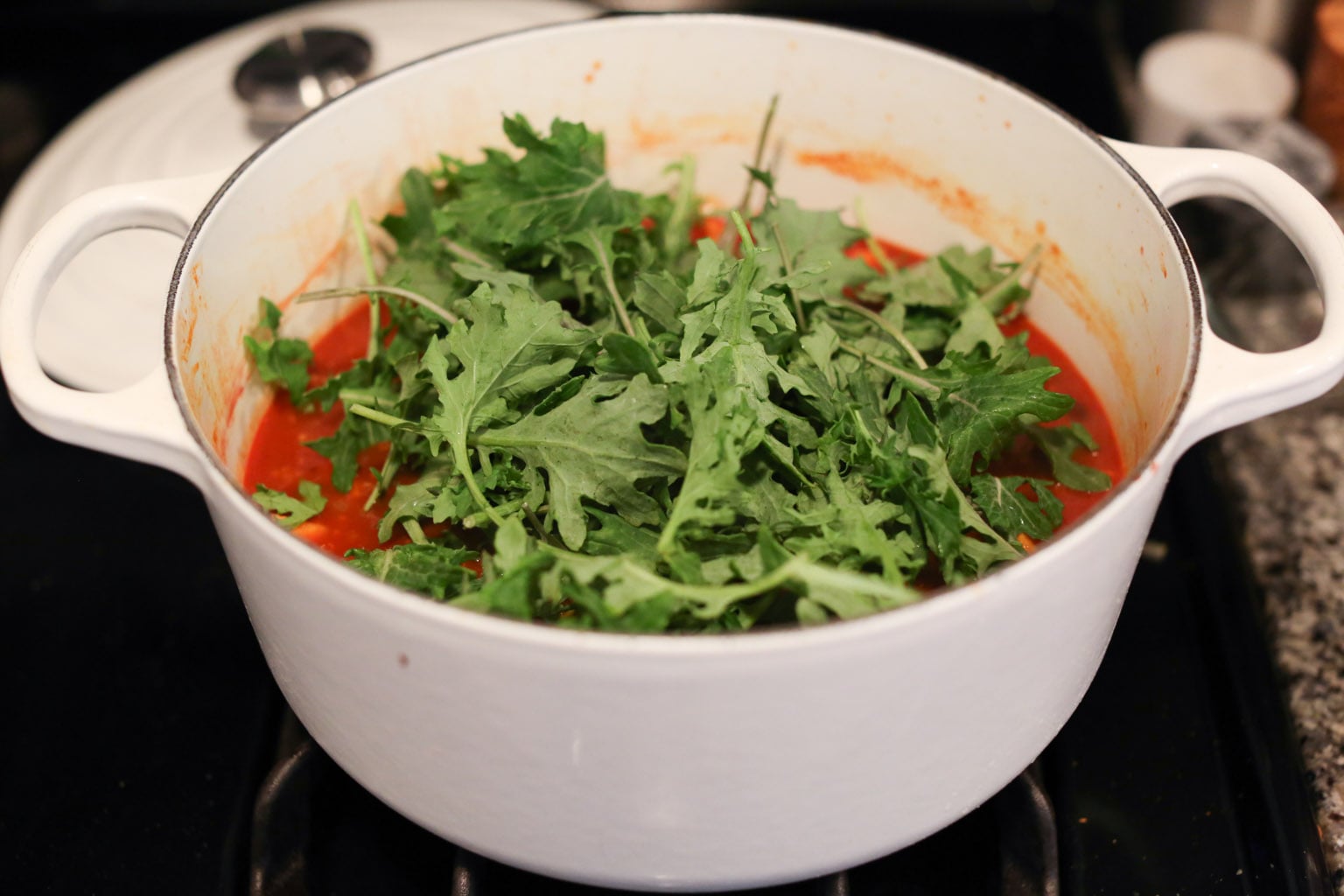 - Heat the olive oil in a medium Dutch oven or heavy-bottomed soup pot over medium heat. When the oil is hot and shimmering, add the onion, garlic, and a pinch of salt and cook for about 5 minutes until the onions are very soft and translucent. (Be very careful not to burn the onions and garlic, people!! If they start to brown at all, turn down the heat immediately.)