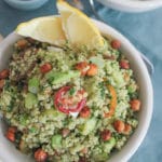 - When the quinoa has cooled, add the cucumber, cherry tomatoes, spinach, avocado and half of the cooked chickpeas to the bowl. Pour the dressing over everything. and gently fold the ingredients together. Taste and season with a little extra salt if necessary.