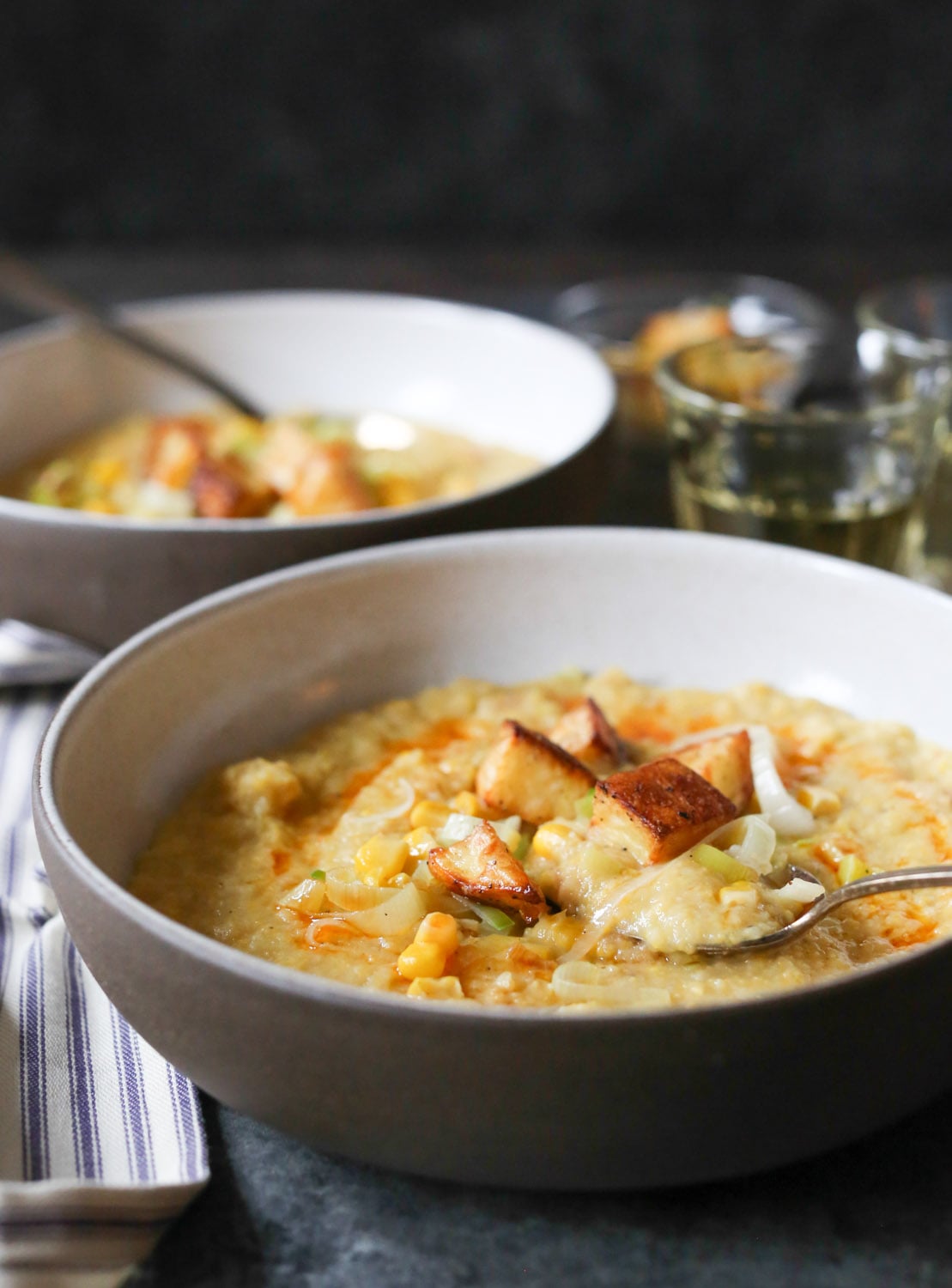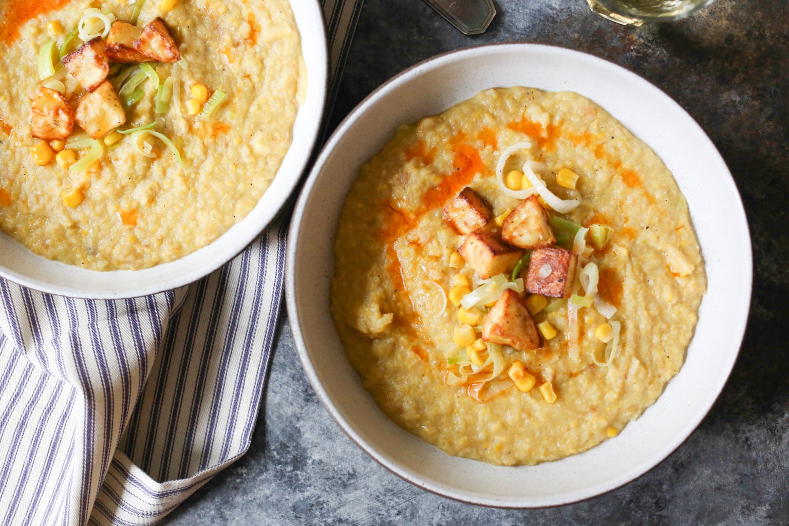 A few quick recipe notes. Since it’s not corn season, I used canned sweet corn, but I love the idea of using grilled corn during the summer months and serving the soup at room temp. If you follow the recipe as written, the soup will be super thick. I’m into that, but if you’re not, just keep adding veggie broth until you reach your desired consistency. And if you don’t feel like turning on the oven, you can definitely skip the roasting step and throw the raw potatoes into the soup (after the veggie broth) and simmer until tender. Finally, I was obsessed with the potato-corn-leek medley garnish. Next time, I’ll probably add an extra leek and ear of corn into the mix and roast an extra potato, so I can have more topping action. You might want to do the same.