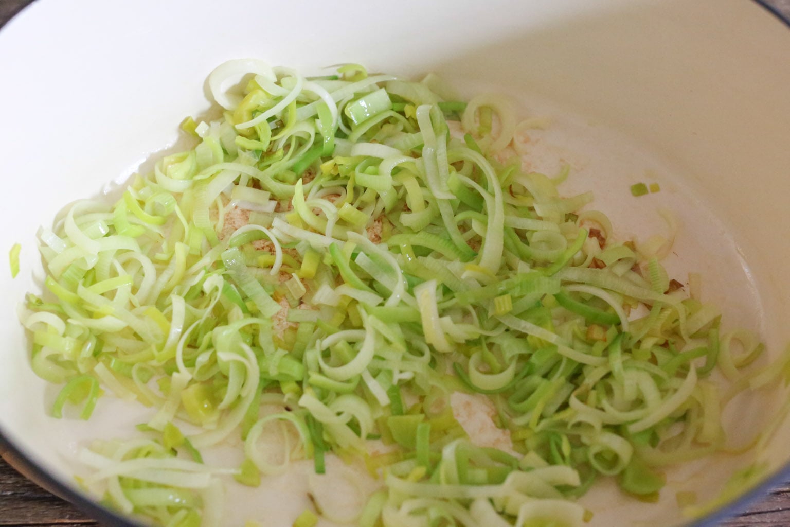 -Meanwhile, place a medium Dutch oven or sauté pan over medium heat and add 1½ tablespoons of olive oil. When the oil is hot and shimmering, add the leeks and sauté until they’re soft, about 5 minutes.