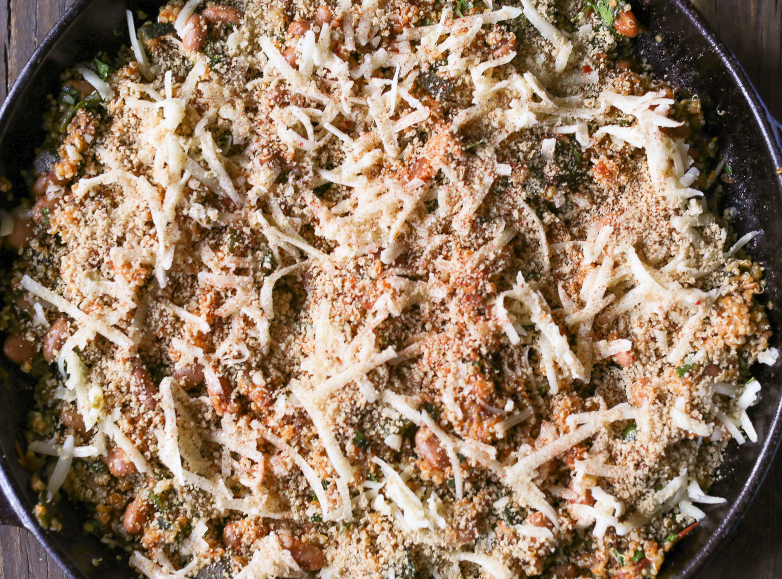 - Turn off the heat and fold in the cooked quinoa, cilantro, and half of the cheese. (Taste your filling. It shouldn’t need any salt, but it’s always worth checking.) Lightly smooth the top of the filling with a spatula. Add the remaining cheese in an even layer and sprinkle with the panko and the remaining ¼ teaspoon of smoked paprika.