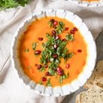 When it comes to toppings, I’m partial to a drizzle of chili oil with cilantro and pomegranate arils—so Christmasy bright and fresh—but the you do you garnishing possibilities are endless. The soup is also delightful with chopped peanuts or cashews, scallions, chives, coconut cream, pesto, herb-infused oil, crumbled bacon(!), etc., etc. Let your creative juices flow.