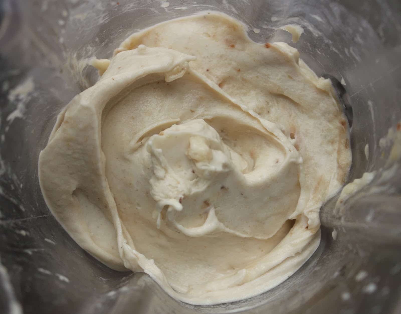 - Place your frozen bananas into a blender or food processor and puree. At first the bananas will take on a sort of sandy texture. This is normal, just keep scraping down the sides and pureeing until they take on the smooth texture of soft-serve ice cream. If you cant get your food processor/blender going, add a tiny splash of milk to help things along.