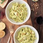 This was my first time using broccoli rabe as a pesto base, and I have to say, it’s delightful. In case you’re not familiar, broccoli rabe is a cruciferous vegetable (like broccoli, cauliflower, etc.), and it has a distinctly bitter taste with some spicy flavors kicking around just below the surface. A quick blanch in salt water tames the bitterness significantly, so when you process the florets with toasted pine nuts, garlic, lemon, crushed red pepper and plenty of parmesan, you get a bright, mild pesto with a hint of earthiness and a subtle kick. I seriously dig it, and while it’s perfect on pasta, I think I’d be just as psyched to dunk veggies in it or spread it on a sandwich (read: grilled cheese).