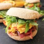 Time to assemble your fancy sandwiches! I like to set up a little assembly line. Muffins, prosciutto, eggs, arugula. Break the prosciutto pieces in half—each sandwich gets 3 halves. Place the prosciutto on the bottom half of each English muffin. Add a quarter of the eggs (this will seem like a lot, but it’s a sandwich…they’ll squish down), and a quarter of the arugula. Close the sandwiches with the top half of the English muffins. Serve warm.